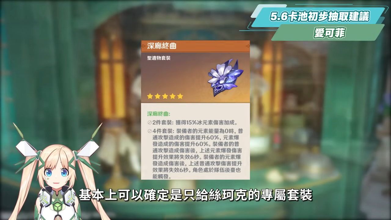 接著是5.6卡池的相關抽取建議方向,愛可菲的定位從前瞻釋出的情報來看,可以知道是凍結體系的多功能輔助,不同於申鶴是完全的輔助,自身也有一定的輸出能力和治療作用,也有持續的後台掛冰能力,並且還是可以隨角色移動的,不同於心海的水母,從機制上和功能性上就已經給洛洛非常不錯的印象分數,加上後面絲珂克和至冬國相關的陣營也即將登場了,從米哈遊裡面輔助角色都是有一定的人權定位的情況下,強度黨或是老玩家基本上都是蠻推薦可以考慮抽取的,並且作為輔助的話,四星武器也有比較多的武器可以考慮先用,像是滿精煉西風長槍這種。此外有培養冰元素輸出或是水元素輸出,想要放在隊伍中組成永凍隊、或是純水隊帶一個愛可菲減抗位,大方向上感覺是沒問題的,但感覺對於冰元素輸出的加強會比較多,因為對於水元素輸出來說,比較沒有像冰元素輸出的聖遺物套裝有對凍結狀態下的敵人有額外加成,但若是單純要減抗,其實也可以考慮更泛用的希諾寧。冰元素輸出像是:綾華、萊歐斯利、甘雨、菲米尼,組成永凍隊,又或是後續的絲珂克,水元素輸出則可以像是達達利亞、綾人、滿命夜蘭、滿命芙寧娜等角色,搭配愛可菲的掛冰除了有減抗外、還可以給敵人附加控制效果。但如果以上這些水冰輸出的角色培養得比較少的話,像是近期才入坑的萌新等等,洛洛會更推薦趕快抽現在5.5下半的希諾寧,減抗和治療的部分希諾寧也都有,並且也不限於水冰輸出,泛用性更廣,愛可菲會更適合想加強水冰角色的老玩家或是強度黨。至於為什麼沒有那維萊特呢?因為那維萊特的天賦會需要搭配其他元素反應來吃天賦的增傷層數,若只組在水冰為主的隊伍中,天賦就只能吃到1層,雖然不排除若是愛可菲的減抗給得夠高的話,龍王就算捨棄那些天賦增傷也能打出足夠的傷害,但以目前的情況來看感覺這樣意義並不大,所以洛洛是覺得除非是滿命龍王比較沒差之外,0~1命的龍王可能還需要等愛可菲實裝後再看看表現。在聖遺物方面,洛洛也先大概給一個準備方向,由於這次沒有看到新的聖遺物,加上愛可菲是輔助,所以也不會是穿「深廊終曲」的,基本上可以確定是只給絲珂克的專屬套裝。