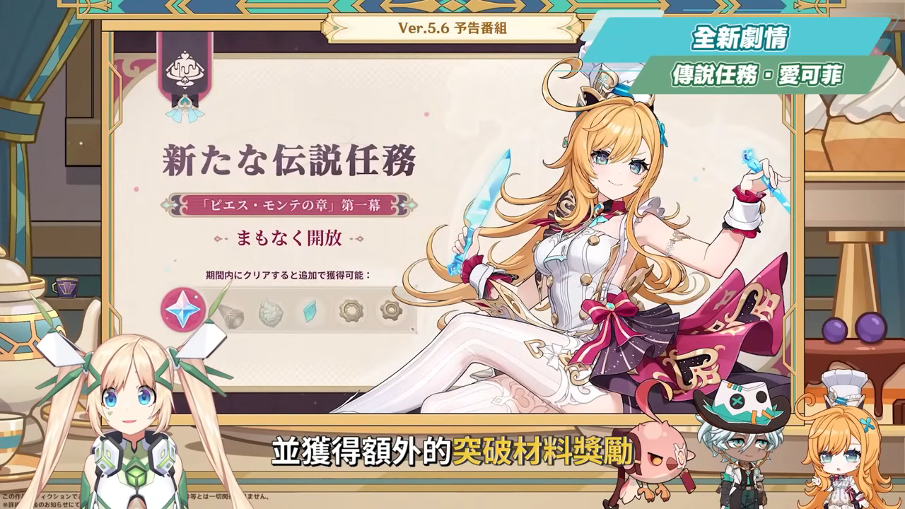 首先帶來相關的卡池情報資訊,5.6版本預計在5/7上線,在上半卡池中,將會實裝全新五星冰元素角色-愛可菲,復刻五星岩元素角色-娜維婭。新的四星風元素角色-伊法也會加入卡池陪跑。
